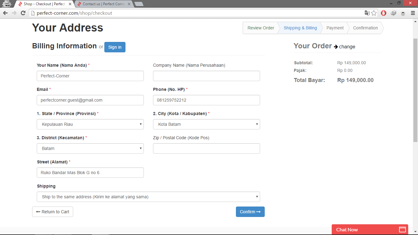 5.Isi data Nama, Email, Provinsi, Kecamatan,No Hp, Kabupaten/Kota, Alamat, Kode Pos(Opsional), Nama Perusahaan(Opsional).